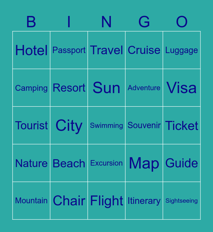 This bingo card has 25 words: Beach, Flight, Sun, Mountain, Luggage, Hotel, Camping, Passport, Souvenir, Excursion, Adventure, Tourist, Map, Guide, Resort, Sightseeing, Ticket, Travel, Visa, City, Swimming, Chair, Nature, Cruise and Itinerary.
