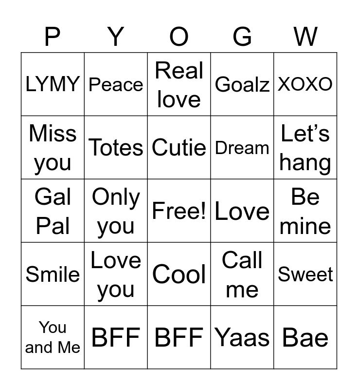 This bingo card has a free space and 24 words: Love you, BFF, Cutie, You and Me, XOXO, LYMY, Miss you, Peace, Love, Cool, Dream, Gal Pal, Call me, Sweet, Totes, Yaas, Be mine, Real love, Let’s hang, Only you, Bae, Smile, Goalz and BFF.