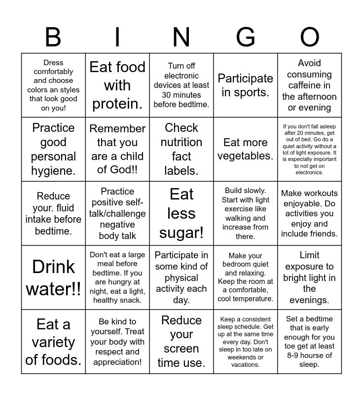 This bingo card has 30 words: Be kind to yourself. Treat your body with respect and appreciation!, Be grateful for what your body does for you!, Practice positive self-talk/challenge negative body talk, Avoid comparing yourself to others!, Dress comfortably and choose colors an styles that look good on you!, Turn off electronic devices at least 30 minutes before bedtime., Remember that you are a child of God!!, Participate in some kind of physical activity each day., Build slowly. Start with light exercise like walking and increase from there., Reduce your screen time use., Make workouts enjoyable. Do activities you enjoy and include friends., Eat less sugar!, Keep a consistent sleep schedule. Get up at the same time every day. Don't sleep in too late on weekends or vacations., Set a bedtime that is early enough for you toe get at least 8-9 hourse of sleep., If you don't fall asleep after 20 minutes, get out of bed. Go do a quiet activity without a lot of light exposure. It is especially important to not get on electronics., Establish a relaxing bedtime routine., Make your bedroom quiet and relaxing. Keep the room at a comfortable, cool temperature., Drink water!!, Don't eat a large meal before bedtime. If you are hungry at night, eat a light, healthy snack., Avoid consuming caffeine in the afternoon or evening, Reduce your. fluid intake before bedtime., Cook your food instead of always eating out., Eat food with protein., Eat more vegetables., Practice good personal hygiene., Participate in sports., Limit exposure to bright light in the evenings., Eat a variety of foods., Check nutrition fact labels. and Decrease salt intake..