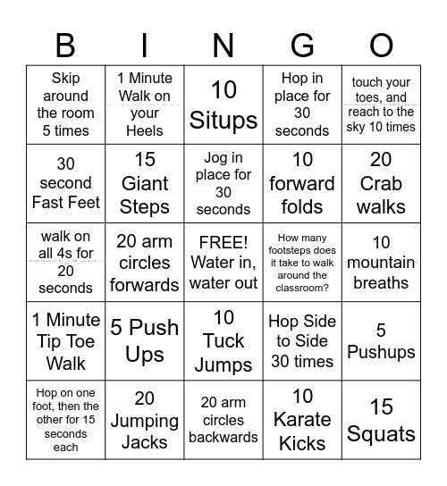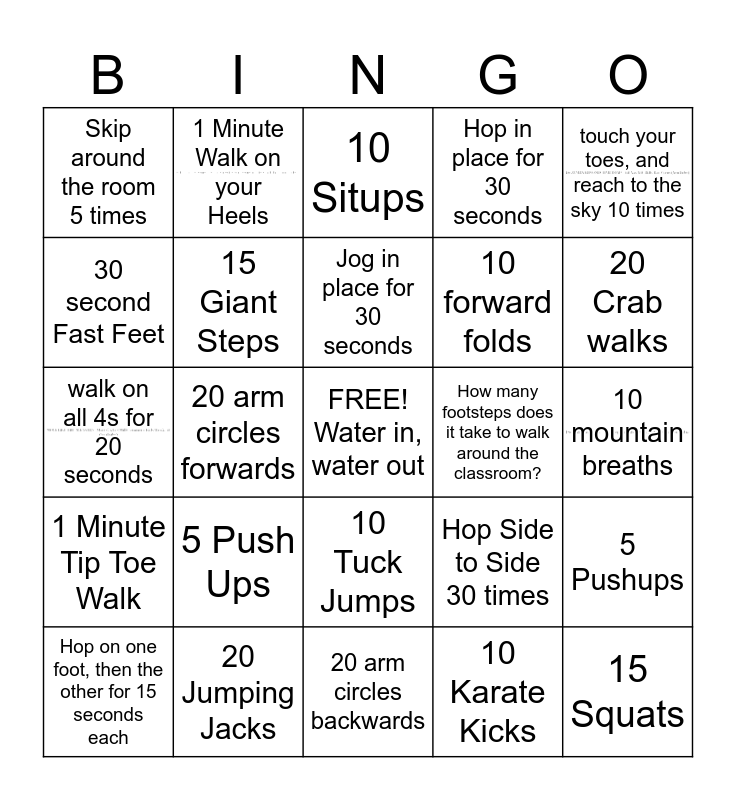 This bingo card has 4 images, a free space and 24 words: 5 Push Ups, 20 Jumping Jacks, Jog in place for 30 seconds, Hop on one foot, then the other for 15 seconds each, touch your toes, and reach to the sky 10 times, Skip around the room 5 times, 30 second Fast Feet, 1 Minute Walk on your Heels, How many footsteps does it take to walk around the classroom?, 10 Tuck Jumps, 10 forward folds, walk on all 4s for 20 seconds, Hop Side to Side 30 times, 5 Pushups, 15 Giant Steps, 10 Karate Kicks, 10 mountain breaths, 10 Situps, 20 Crab walks, 20 arm circles forwards, 15 Squats, 1 Minute Tip Toe Walk, Hop in place for 30 seconds and 20 arm circles backwards.