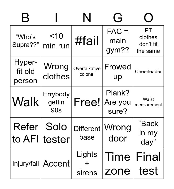 This bingo card has a free space and 24 words: Solo tester, Accent, Overtalkative colonel, Injury/fall, PT clothes don’t fit the same, “Who’s Supra??”, Hyper-fit old person, <10 min run, Plank? Are you sure?, Different base, Frowed up, Walk, Wrong door, “Back in my day”, Wrong clothes, Time zone, Waist measurement, #fail, Cheerleader, Errybody gettin 90s, Final test, Refer to AFI, FAC = main gym?? and Lights + sirens.