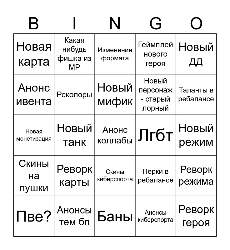 This bingo card has 36 words: Аарон Жопер Льёт воду, Азиат который не знает какую игру продаёт, Новый скин на кири/юно/мерсу, Реколоры, Перки в ребалансе, Скины на пушки, Новый мифик, Новый мифический ган, Новый дд, Новый сап, Новый танк, Геймплей нового героя, Новая косметика, Лгбт, Таланты в ребалансе, Новая карта, Реворк героя, Реворк карты, Анонс коллабы, Изменение формата, Новый режим, Реворк режима, Анонсы тем бп, Пве?, Баны, Какая нибудь фишка из МР, Новая монетизация, Изменение системы рейтинга, Новый персонаж - старый лорный, Анонс ивента, Разраб - ноунейм, Новые пикапы на картах, Анонсы киберспорта, Скины киберспорта, Извинения and Коротко метражка.