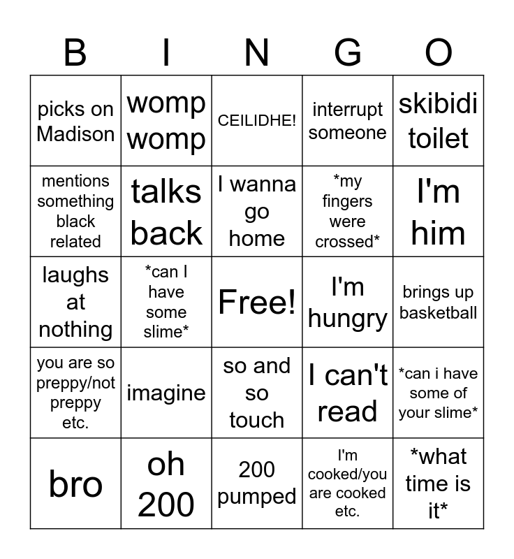 This bingo card has a free space and 24 words: bro, imagine, I wanna go home, I'm cooked/you are cooked etc., skibidi toilet, picks on Madison, womp womp, CEILIDHE!, I'm hungry, brings up basketball, laughs at nothing, talks back, I can't read, *can i have some of your slime*, mentions something black related, oh 200, 200 pumped, interrupt someone, I'm him, you are so preppy/not preppy etc., *can I have some slime*, so and so touch, *my fingers were crossed* and *what time is it*.
