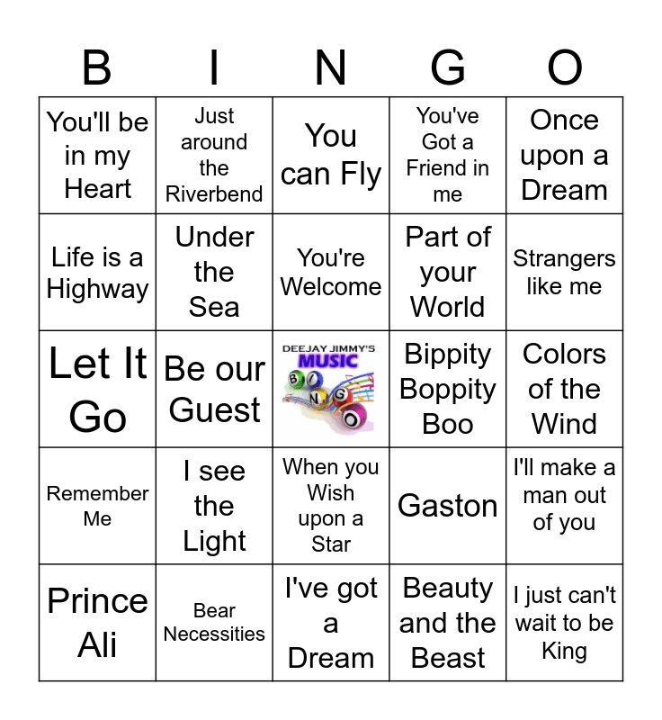 This bingo card has a free space and 40 words: Hakuna Matata, Let It Go, Friend like Me, Under the Sea, Bear Necessities, When you Wish upon a Star, You're Welcome, When will my life begin, Once upon a Dream, Remember Me, Be our Guest, You've Got a Friend in me, I just can't wait to be King, Colors of the Wind, Bippity Boppity Boo, I see the Light, A whole new World, You'll be in my Heart, Almost There, You can Fly, I'll make a man out of you, Beauty and the Beast, Part of your World, Life is a Highway, Cruella De Vil, I wanna be like you, How Far I'll Go, If I didn't have you, Heigh Ho, Circle of Life, Bella Notte, Prince Ali, Kiss the Girl, Gaston, Strangers like me, I've got a Dream, Love is an open door, Reflection, Just around the Riverbend and On my Way.