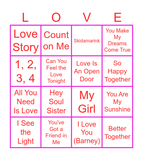 This bingo card has 16 words: You've Got a Friend in Me, You Are My Sunshine, Skidamarink, Love Story, All You Need Is Love, Count on Me, My Girl, I Love You (Barney), 1, 2, 3, 4, Can You Feel the Love Tonight, I See the Light, You Make My Dreams Come True, Hey Soul Sister, So Happy Together, Love Is An Open Door and Better Together.