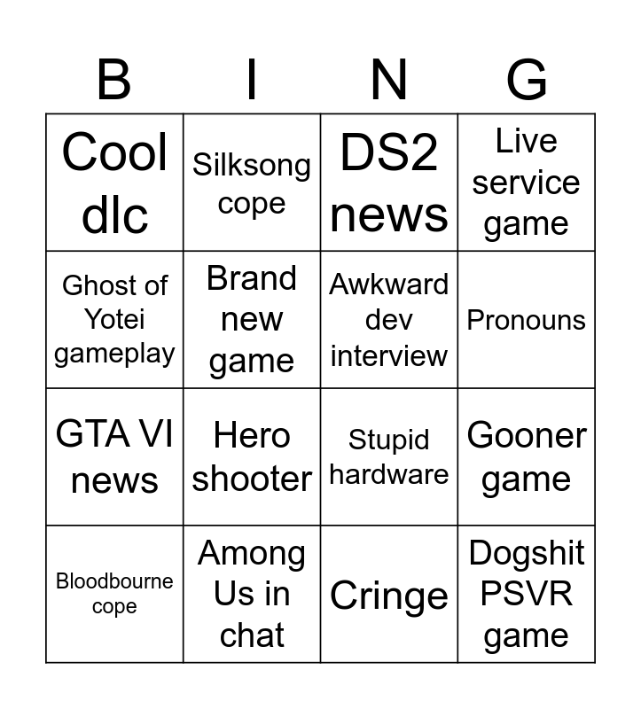 This bingo card has 16 words: Among Us in chat, Gooner game, DS2 news, Cool dlc, GTA VI news, Silksong cope, Stupid hardware, Cringe, Ghost of Yotei gameplay, Brand new game, Bloodbourne cope, Live service game, Hero shooter, Pronouns, Awkward dev interview and Dogshit PSVR game.