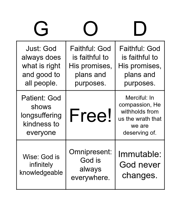 This bingo card has a free space and 25 words: Omnipotent: God is all powerful., Omniscient: He is all knowing., Omnipresent: God is always everywhere., Eternal: God has no beginning and no end., Immutable: God never changes., Just: God always does what is right and good to all people., Merciful: In compassion, He withholds from us the wrath that we are deserving of., Faithful: God is faithful to His promises, plans and purposes., Good and perfect: He is without sin and there is no evil in Him., Loving: God’s love is eternal and steadfast. His love has no limits., Self-Sufficient: God has no needs., Sovereign: God is ruler over all of creation., Righteous: God is blameless and upright., Patient: God shows longsuffering kindness to everyone, Wise: God is infinitely knowledgeable, Just: God always does what is right and good to all people., Merciful: In compassion, He withholds from us the wrath that we are deserving of., Faithful: God is faithful to His promises, plans and purposes., Good and perfect: He is without sin and there is no evil in Him., Loving: God’s love is eternal and steadfast. His love has no limits., Self-Sufficient: God has no needs., Sovereign: God is ruler over all of creation., Righteous: God is blameless and upright., Patient: God shows longsuffering kindness to everyone and Wise: God is infinitely knowledgeable.