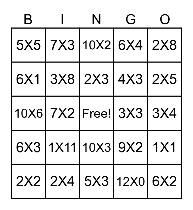 This bingo card has a free space and 29 words: 2X2, 5X6, 7X2, 4X4, 5X5, 10X2, 3X8, 1X11, 3X3, 2X4, 3X4, 6X2, 5X3, 12X0, 2X5, 10X5, 10X3, 6X3, 2X8, 10X6, 9X2, 1X7, 4X3, 6X1, 6X4, 7X3, 1X1, 2X3 and 3X1.