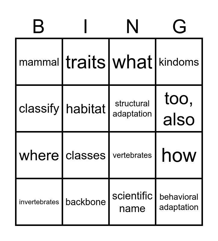 This bingo card has 16 words: backbone, how, what, mammal, where, traits, vertebrates, scientific name, classify, habitat, invertebrates, kindoms, classes, too, also, structural adaptation and behavioral adaptation.