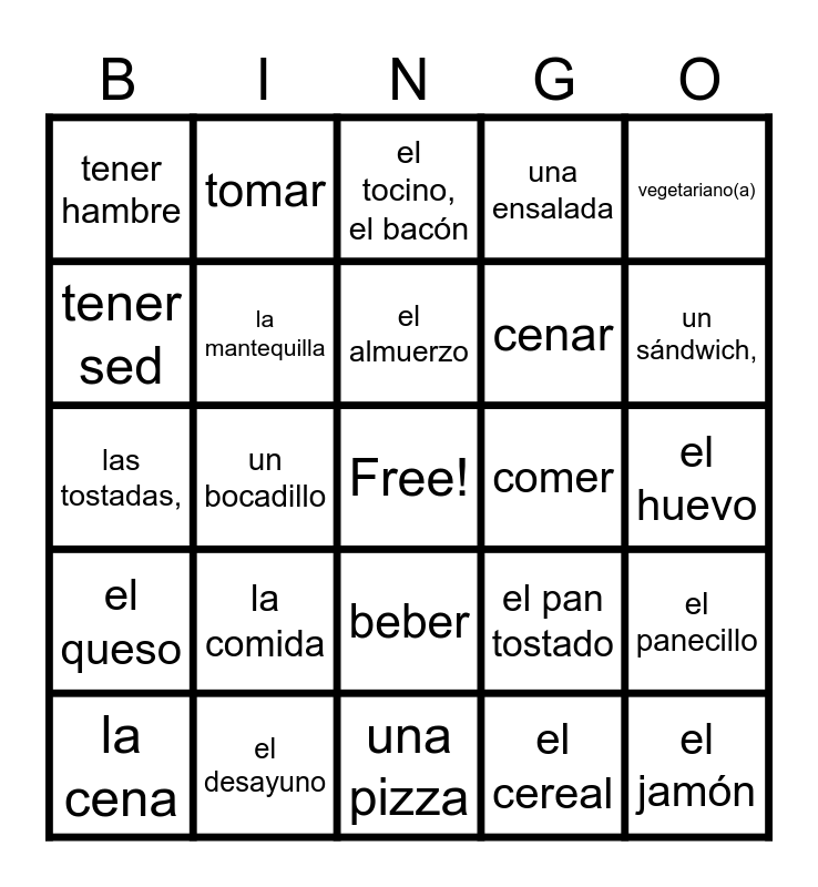 This bingo card has a free space and 24 words: la comida, el desayuno, el almuerzo, la cena, vegetariano(a), tener hambre, tener sed, tomar, comer, beber, cenar, las tostadas,, el pan tostado, el panecillo, la mantequilla, el cereal, el huevo, el tocino, el bacón, un sándwich,, un bocadillo, el jamón, el queso, una ensalada and una pizza.