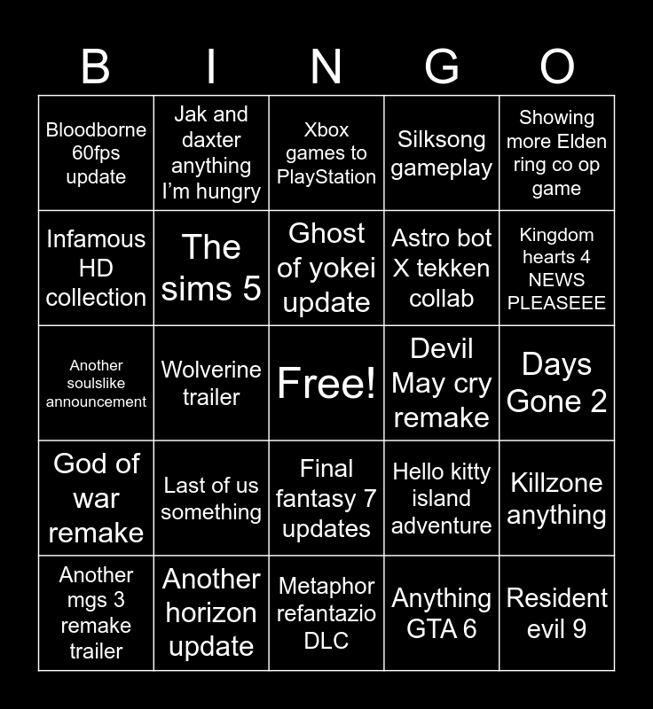 This bingo card has a free space and 24 words: Last of us something, Another horizon update, Ghost of yokei update, Another mgs 3 remake trailer, Showing more Elden ring co op game, Bloodborne 60fps update, Infamous HD collection, Jak and daxter anything I’m hungry, Devil May cry remake, Final fantasy 7 updates, Astro bot X tekken collab, Another soulslike announcement, Hello kitty island adventure, Killzone anything, The sims 5, Anything GTA 6, Days Gone 2, Xbox games to PlayStation, Kingdom hearts 4 NEWS PLEASEEE, Wolverine trailer, Resident evil 9, God of war remake, Silksong gameplay and Metaphor refantazio DLC.
