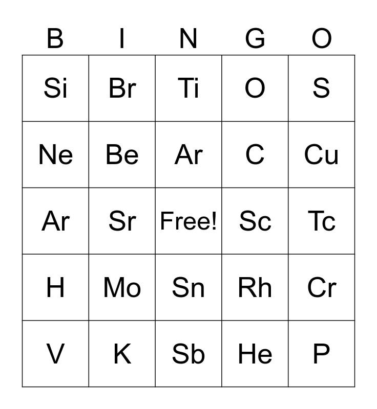 This bingo card has a free space and 60 words: Hg, K, Na, H, He, Li, Be, B, C, N, O, F, Ne, Mg, Al, Si, P, S, Cl, Ar, Sc, Ti, V, Cr, Mn, Fe, Co, Ni, Cu, Zn, Ga, Ge, As, Se, Br, Kr, Rb, Sr, Y, Ar, Nb, Mo, Tc, Ru, Rh, Pd, Ag, Cd, In, Sn, Sb, Te, I, Xe, Cs, Bar, La, Ce, Pr and Nd.