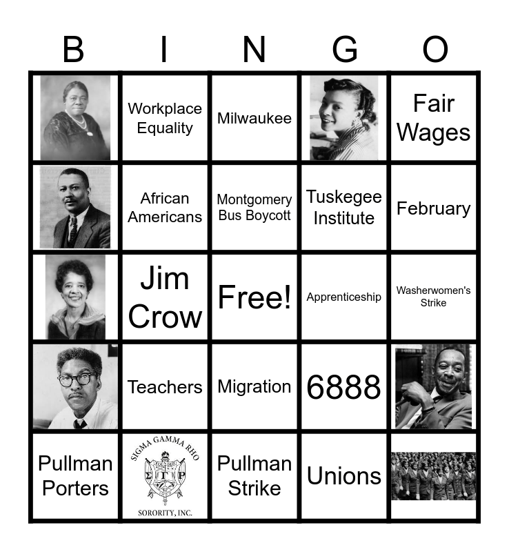 This bingo card has 10 images, a free space and 19 words: Pullman Porters, Jim Crow, Labor, Milwaukee, African Americans, Teachers, Apprenticeship, Washerwomen's Strike, Pullman Strike, Unions, February, NAACP, Migration, Fair Wages, 6888, Tuskegee Institute, Workplace Equality, Montgomery Bus Boycott and Entertainment Industry.