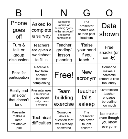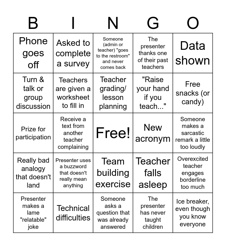 This bingo card has a free space and 24 words: Presenter uses a buzzword that doesn't really mean anything, Technical difficulties, Teacher grading/ lesson planning, Presenter makes a lame "relatable" joke, Data shown, Phone goes off, Turn & talk or group discussion, Asked to complete a survey, New acronym, Team building exercise, "Raise your hand if you teach...", Prize for participation, Teacher falls asleep, Overexcited teacher engages borderline too much, Teachers are given a worksheet to fill in, The presenter has never taught children, Someone makes a sarcastic remark a little too loudly, Someone (admin or teacher) "goes to the restroom" and never comes back, Free snacks (or candy), Receive a text from another teacher complaining, Ice breaker, even though you know everyone, Really bad analogy that doesn't land, The presenter thanks one of their past teachers and Someone asks a question that was already answered.