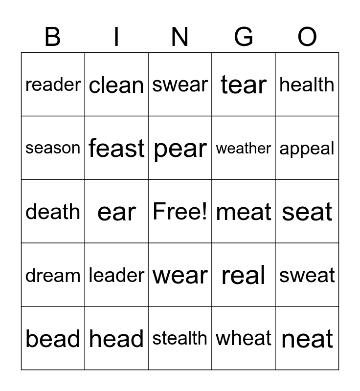 This bingo card has a free space and 40 words: great, death, least, feast, head, wear, pear, heal, health, dream, ear, tear, neat, seat, meat, leader, lead, reader, read, swear, sweat, wheat, weather, season, break, beak, freak, tread, peace, steam, knead, bead, peanut, real, appeal, stealth, steal, heard, clean and Heather.