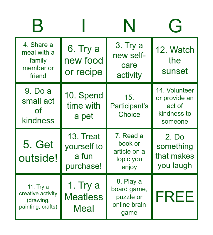 This bingo card has 16 words: 1. Try a Meatless Meal, 2. Do something that makes you laugh, 3. Try a new self-care activity, 4. Share a meal with a family member or friend, 5. Get outside!, 6. Try a new food or recipe, 7. Read a book or article on a topic you enjoy, 8. Play a board game, puzzle or online brain game, 9. Do a small act of kindness, 10. Spend time with a pet, 11. Try a creative activity (drawing, painting, crafts), 12. Watch the sunset, 13. Treat yourself to a fun purchase!, 14. Volunteer or provide an act of kindness to someone, 15. Participant's Choice and FREE.