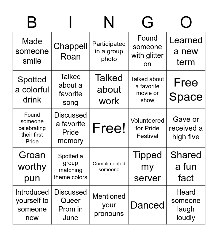 This bingo card has a free space and 25 words: Spotted a group matching theme colors, Mentioned your pronouns, Talked about work, Introduced yourself to someone new, Learned a new term, Made someone smile, Spotted a colorful drink, Chappell Roan, Volunteered for Pride Festival, Complimented someone, Talked about a favorite movie or show, Found someone celebrating their first Pride, Tipped my server, Shared a fun fact, Talked about a favorite song, Spotted a creative sign, Gave or received a high five, Participated in a group photo, Free Space, Discussed a favorite Pride memory, Heard someone laugh loudly, Discussed Queer Prom in June, Groan worthy pun, Found someone with glitter on and Danced.
