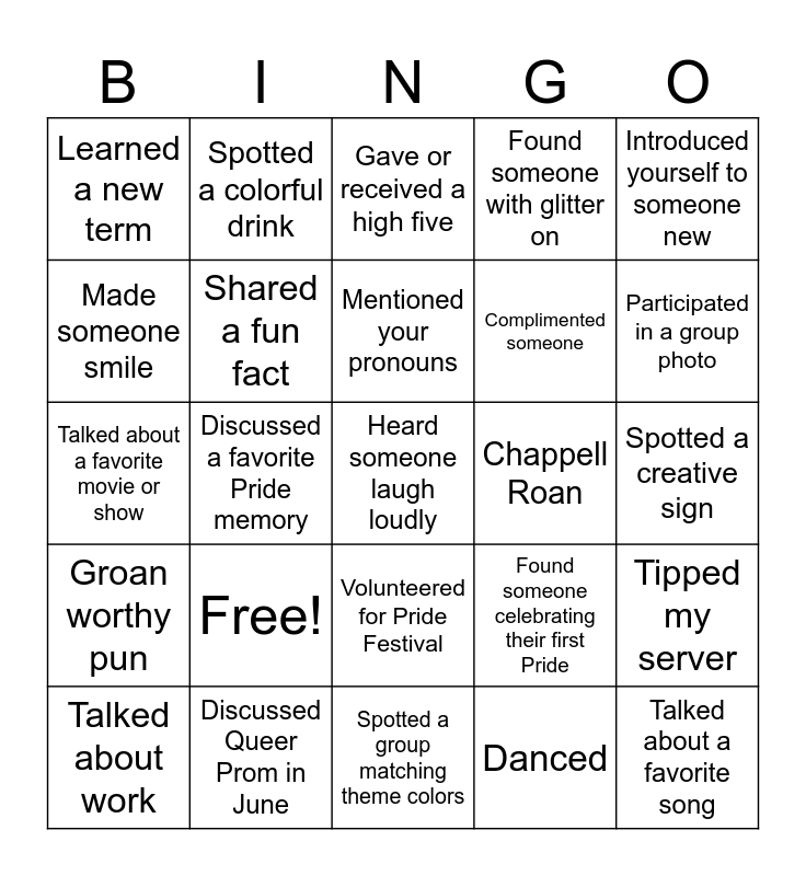 This bingo card has 25 words: Free!, Spotted a group matching theme colors, Mentioned your pronouns, Talked about work, Introduced yourself to someone new, Learned a new term, Made someone smile, Spotted a colorful drink, Chappell Roan, Volunteered for Pride Festival, Complimented someone, Talked about a favorite movie or show, Found someone celebrating their first Pride, Tipped my server, Shared a fun fact, Talked about a favorite song, Spotted a creative sign, Gave or received a high five, Participated in a group photo, Discussed a favorite Pride memory, Heard someone laugh loudly, Discussed Queer Prom in June, Groan worthy pun, Found someone with glitter on and Danced.