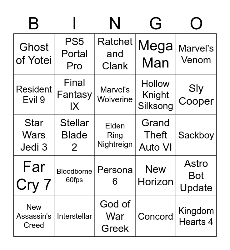 This bingo card has 25 words: Bloodborne 60fps, God of War Greek, Marvel's Wolverine, New Assassin's Creed, Marvel's Venom, Ghost of Yotei, Resident Evil 9, PS5 Portal Pro, Grand Theft Auto VI, Persona 6, Hollow Knight Silksong, Star Wars Jedi 3, New Horizon, Astro Bot Update, Final Fantasy IX, Kingdom Hearts 4, Sackboy, Ratchet and Clank, Sly Cooper, Stellar Blade 2, Elden Ring Nightreign, Interstellar, Far Cry 7, Mega Man and Concord.