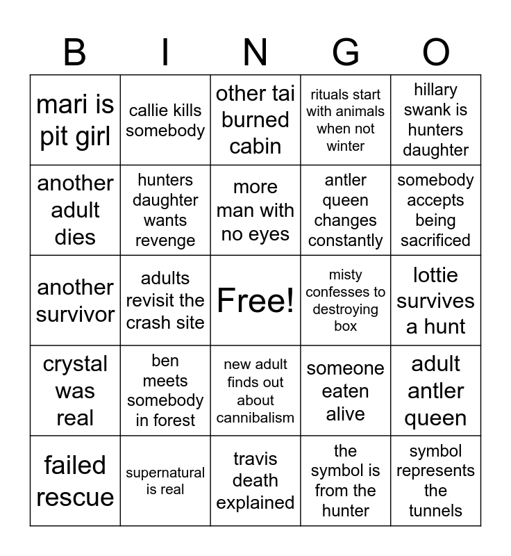 This bingo card has a free space and 24 words: ben meets somebody in forest, supernatural is real, more man with no eyes, failed rescue, hillary swank is hunters daughter, mari is pit girl, another adult dies, callie kills somebody, misty confesses to destroying box, new adult finds out about cannibalism, antler queen changes constantly, another survivor, someone eaten alive, adult antler queen, hunters daughter wants revenge, the symbol is from the hunter, lottie survives a hunt, other tai burned cabin, somebody accepts being sacrificed, adults revisit the crash site, symbol represents the tunnels, crystal was real, rituals start with animals when not winter and travis death explained.