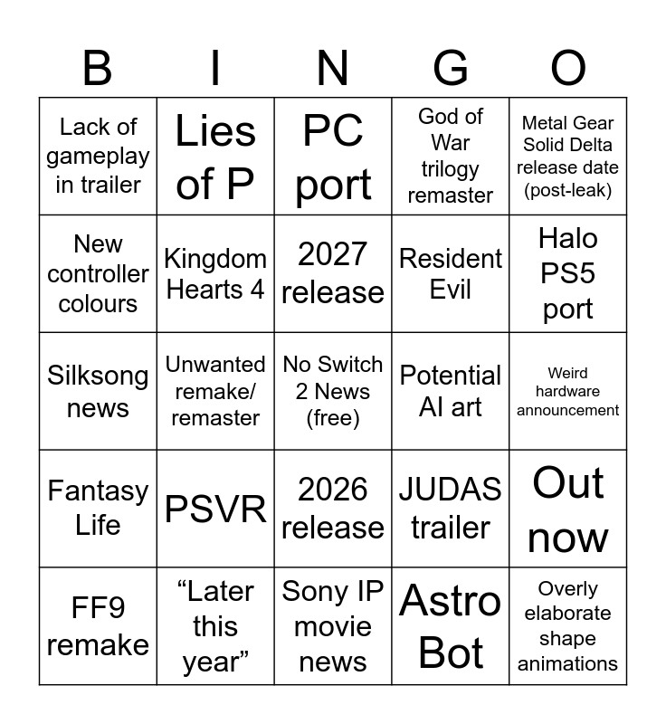This bingo card has a free space and 40 words: GTA news, Silksong news, Sonic game, Kingdom Hearts 4, “Later this year”, 2026 release, 2027 release, Bloodborne remastered🤡, Metal Gear Solid Delta release date (post-leak), Fantasy Life, Unwanted remake/ remaster, God of War trilogy remaster, Overly elaborate shape animations, Weird hardware announcement, Potential AI art, PSVR, Generic JRPG, Lack of gameplay in trailer, Ray tracing, PC port, Out now, Astro Bot, Resident Evil, New controller colours, Elden Ring, Ghost of Yotei, PS5 Pro plates, FF Tactics, Death Stranding 2, Silent Hill f, Marathon, FF9 remake, Horizon multiplayer game, JUDAS trailer, Halo PS5 port, Sony IP movie news, New IP, Persona 6, Lies of P and Borderlands 4.