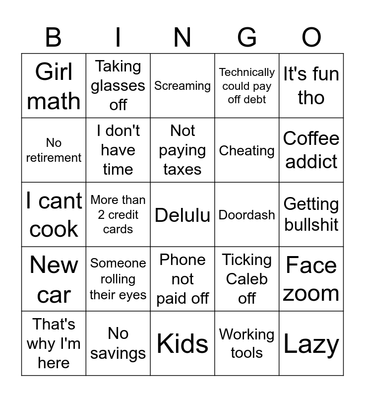 This bingo card has a free space and 24 words: That's why I'm here, Someone rolling their eyes, Not paying taxes, Working tools, It's fun tho, Girl math, Taking glasses off, Screaming, Doordash, Getting bullshit, I cant cook, I don't have time, Ticking Caleb off, Face zoom, No retirement, No savings, Kids, Technically could pay off debt, Coffee addict, New car, More than 2 credit cards, Phone not paid off, Cheating and Lazy.