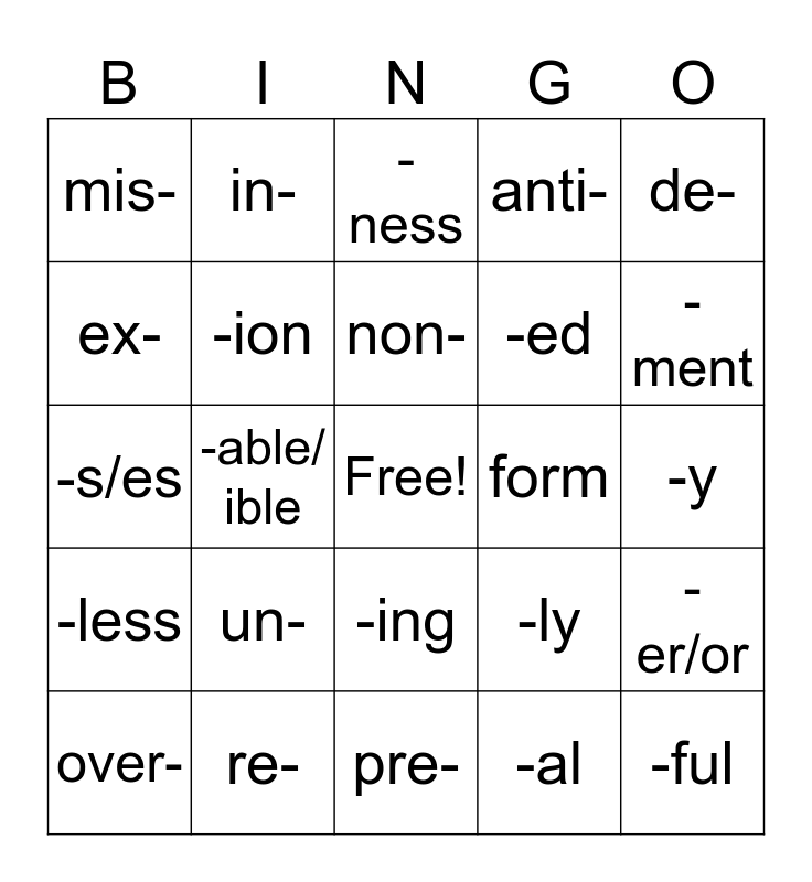 This bingo card has a free space and 24 words: un-, re-, non-, over-, de-, mis-, ex-, in-, form, -ing, -ed, -s/es, -ly, -er/or, -ion, -al, -y, -ness, -ment, -able/ ible, -ful, -less, anti- and pre-.