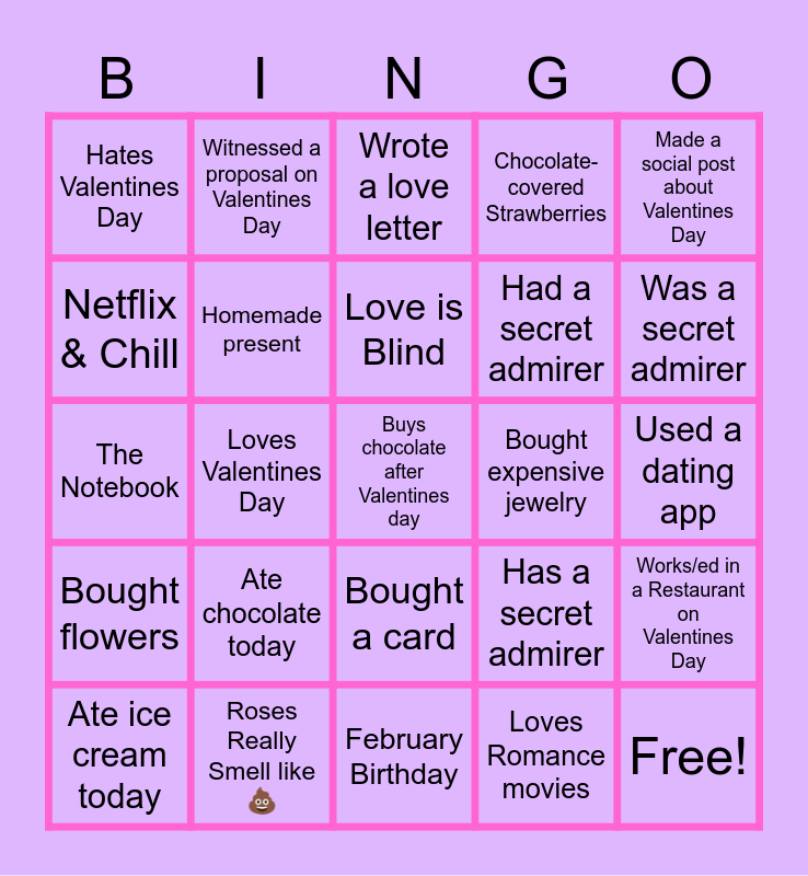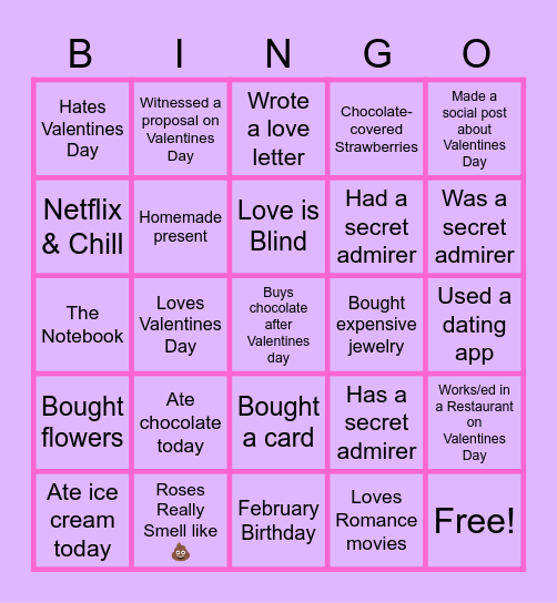 This bingo card has 31 words: February Birthday, Received Flowers, Loves Valentines Day, Single this V-Day, Hates Valentines Day, Wrote a love letter, Homemade present, Has a secret admirer, Bought expensive jewelry, Loves Romance movies, Used a dating app, Buys chocolate after Valentines day, Free!, Loves romantic comedies, Was a secret admirer, Has dating app on phone, Works/ed in a Restaurant on Valentines Day, Ate chocolate today, Bought flowers, Bought a card, Made a social post about Valentines Day, Doesn't have a plan yet for Valentines Day, Ate ice cream today, Witnessed a proposal on Valentines Day, Had a secret admirer, Netflix & Chill, Chocolate-covered Strawberries, The Notebook, Roses Really Smell like 💩, Love is Blind and Love at First Sight.
