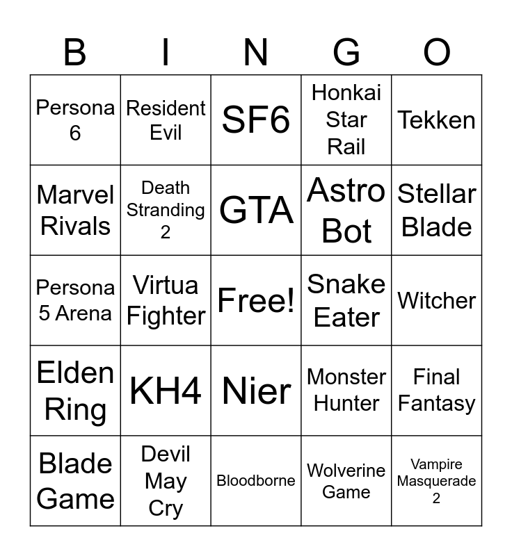 This bingo card has a free space and 24 words: KH4, Devil May Cry, GTA, Blade Game, Tekken, Persona 6, Marvel Rivals, Resident Evil, Snake Eater, Nier, Astro Bot, Persona 5 Arena, Monster Hunter, Final Fantasy, Death Stranding 2, Wolverine Game, Witcher, SF6, Stellar Blade, Virtua Fighter, Vampire Masquerade 2, Elden Ring, Honkai Star Rail and Bloodborne.