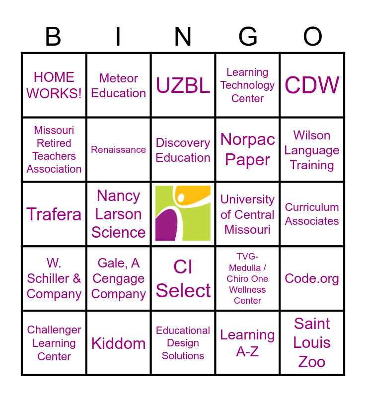 This bingo card has a free space and 25 words: Gale, A Cengage Company, Educational Design Solutions, Discovery Education, Challenger Learning Center, CDW, HOME WORKS!, Missouri Retired Teachers Association, Meteor Education, University of Central Missouri, CI Select, Norpac Paper, Trafera, TVG-Medulla / Chiro One Wellness Center, Code.org, Renaissance, MOREnet, Curriculum Associates, UZBL, Wilson Language Training, Nancy Larson Science, Saint Louis Zoo, Kiddom, W. Schiller & Company, Learning Technology Center and Learning A-Z.