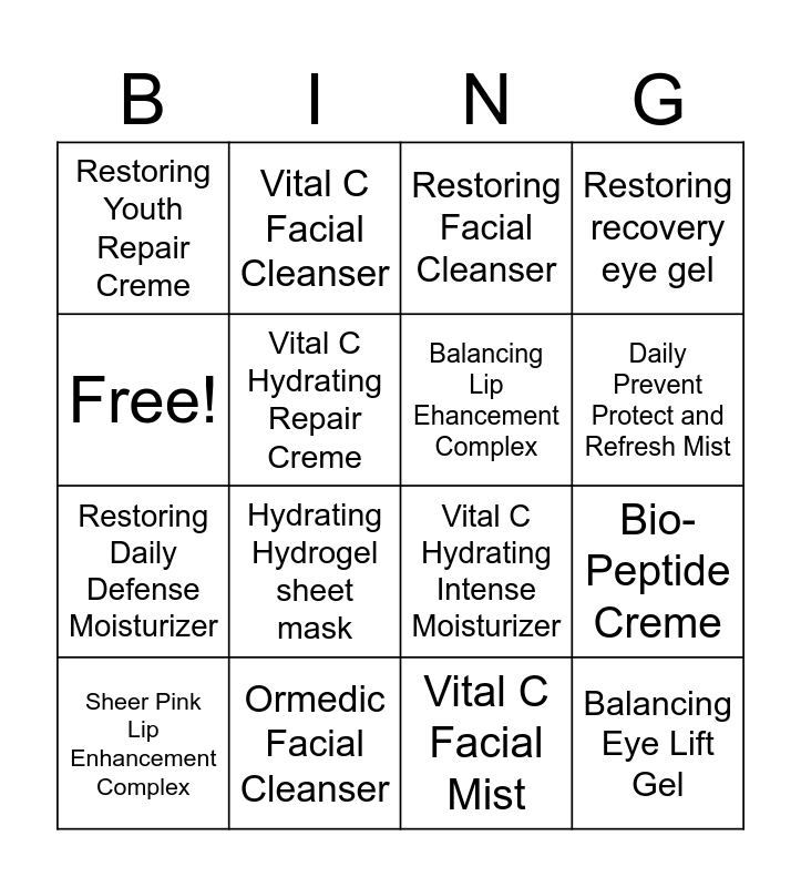 This bingo card has 16 words: Ormedic Facial Cleanser, Bio-Peptide Creme, Restoring Facial Cleanser, Restoring Youth Repair Creme, Restoring Daily Defense Moisturizer, Vital C Facial Cleanser, Vital C Hydrating Intense Moisturizer, Vital C Facial Mist, Free!, Vital C Hydrating Repair Creme, Sheer Pink Lip Enhancement Complex, Restoring recovery eye gel, Hydrating Hydrogel sheet mask, Daily Prevent Protect and Refresh Mist, Balancing Lip Ehancement Complex and Balancing Eye Lift Gel.