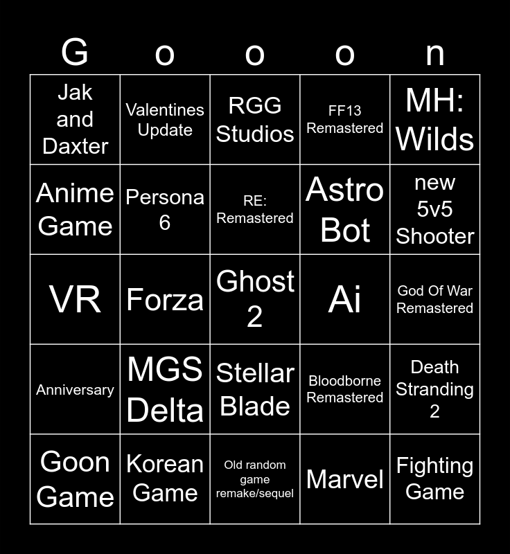 This bingo card has 25 words: MGS Delta, Old random game remake/sequel, RE: Remastered, Goon Game, MH: Wilds, Jak and Daxter, Anime Game, Valentines Update, Ai, Stellar Blade, Astro Bot, VR, Bloodborne Remastered, Death Stranding 2, Persona 6, Fighting Game, God Of War Remastered, RGG Studios, new 5v5 Shooter, Forza, Ghost 2, Korean Game, Anniversary, FF13 Remastered and Marvel.