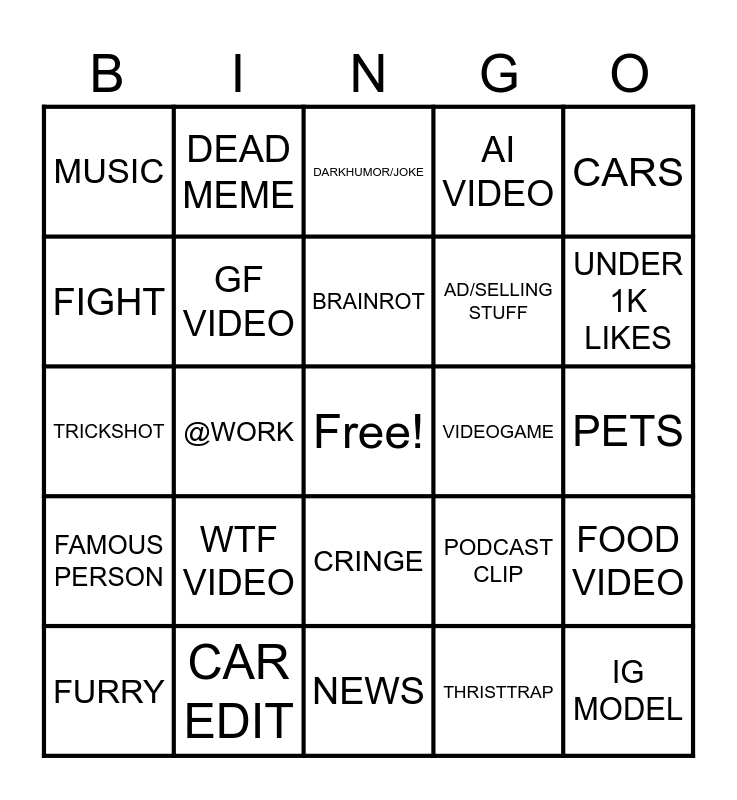 This bingo card has a free space and 26 words: CRINGE, THRISTTRAP, BRAINROT, CAR EDIT, CARS, MUSIC, FIGHT, DEAD MEME, PETS, PODCAST CLIP, AD/SELLING STUFF, TRICKSHOT, FOOD VIDEO, FURRY, @WORK, GYM, AI VIDEO, FAMOUS PERSON, DARKHUMOR/JOKE, IG MODEL, UNDER 1K LIKES, NEWS, VIDEOGAME, WTF VIDEO, GF VIDEO and CAT VIDEOS.