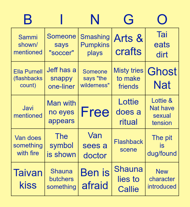 This bingo card has a free space and 24 words: Taivan kiss, The symbol is shown, Someone says "the wilderness", Shauna lies to Callie, Tai eats dirt, Sammi shown/ mentioned, Someone says "soccer", Smashing Pumpkins plays, Lottie does a ritual, Lottie & Nat have sexual tension, Javi mentioned, Jeff has a snappy one-liner, Flashback scene, The pit is dug/found, Ella Purnell (flashbacks count), Shauna butchers something, Ben is afraid, Arts & crafts, Ghost Nat, Van does something with fire, Man with no eyes appears, Van sees a doctor, Misty tries to make friends and New character introduced.