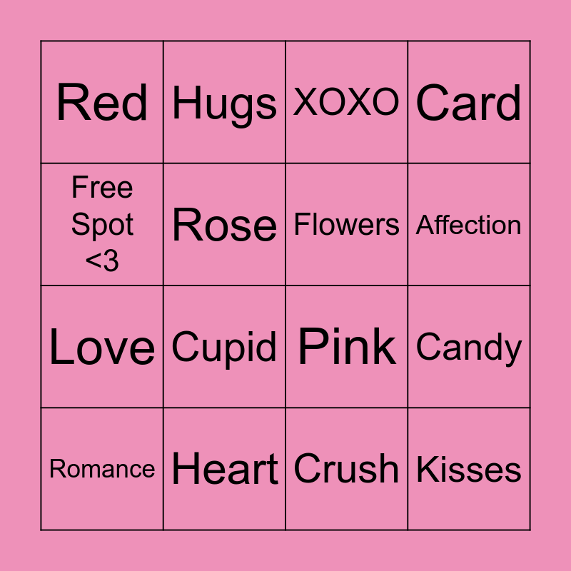 This bingo card has 16 words: Heart, Candy, XOXO, Red, Love, Hugs, Pink, Crush, Free Spot <3, Rose, Romance, Card, Cupid, Affection, Flowers and Kisses.