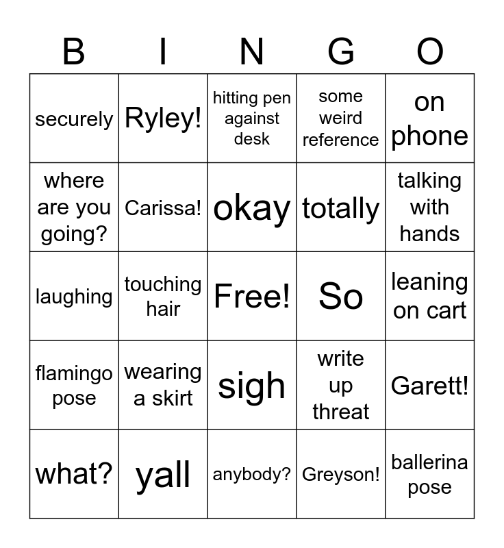 This bingo card has a free space and 24 words: wearing a skirt, yall, okay, what?, on phone, securely, where are you going?, Ryley!, So, sigh, totally, laughing, write up threat, Garett!, Carissa!, Greyson!, leaning on cart, hitting pen against desk, talking with hands, touching hair, ballerina pose, flamingo pose, some weird reference and anybody?.