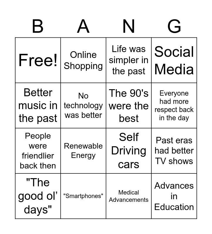 This bingo card has 16 words: "The good ol’ days", "Smartphones", Life was simpler in the past, Social Media, Better music in the past, Online Shopping, Self Driving cars, Past eras had better TV shows, Free!, No technology was better, Medical Advancements, Everyone had more respect back in the day, People were friendlier back then, Renewable Energy, The 90's were the best and Advances in Education.