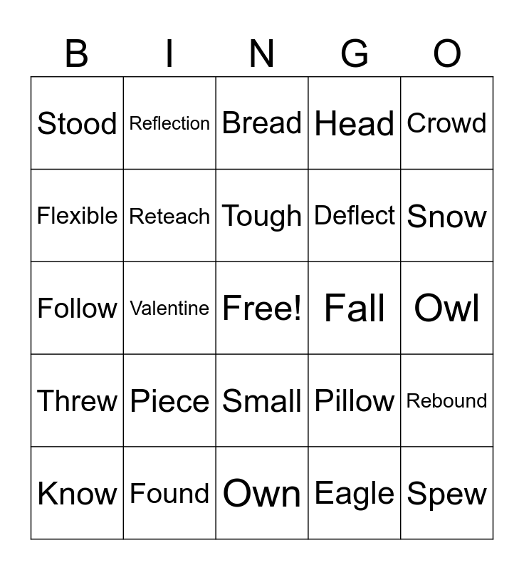 This bingo card has a free space and 24 words: Piece, Found, Tough, Know, Crowd, Stood, Flexible, Reflection, Fall, Small, Deflect, Follow, Pillow, Rebound, Reteach, Eagle, Owl, Bread, Snow, Valentine, Spew, Threw, Head and Own.
