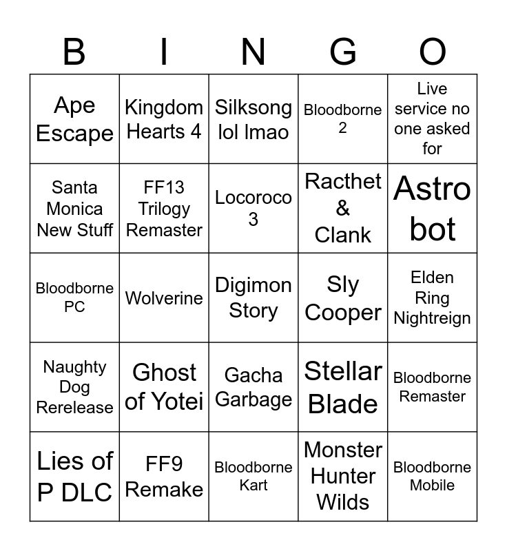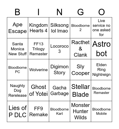 This bingo card has a free space and 24 words: Ghost of Yotei, FF9 Remake, Locoroco 3, Lies of P DLC, Live service no one asked for, Ape Escape, Santa Monica New Stuff, Kingdom Hearts 4, Sly Cooper, Gacha Garbage, Racthet & Clank, Bloodborne PC, Stellar Blade, Bloodborne Remaster, FF13 Trilogy Remaster, Monster Hunter Wilds, Elden Ring Nightreign, Silksong lol lmao, Astro bot, Wolverine, Bloodborne Mobile, Naughty Dog Rerelease, Bloodborne 2 and Bloodborne Kart.