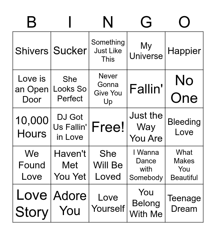 This bingo card has a free space and 24 words: Haven't Met You Yet, Adore You, Never Gonna Give You Up, Love Story, Happier, Shivers, Love is an Open Door, Sucker, Just the Way You Are, She Will Be Loved, Fallin', 10,000 Hours, I Wanna Dance with Somebody, What Makes You Beautiful, She Looks So Perfect, You Belong With Me, Bleeding Love, Something Just Like This, No One, DJ Got Us Fallin' in Love, Teenage Dream, We Found Love, My Universe and Love Yourself.