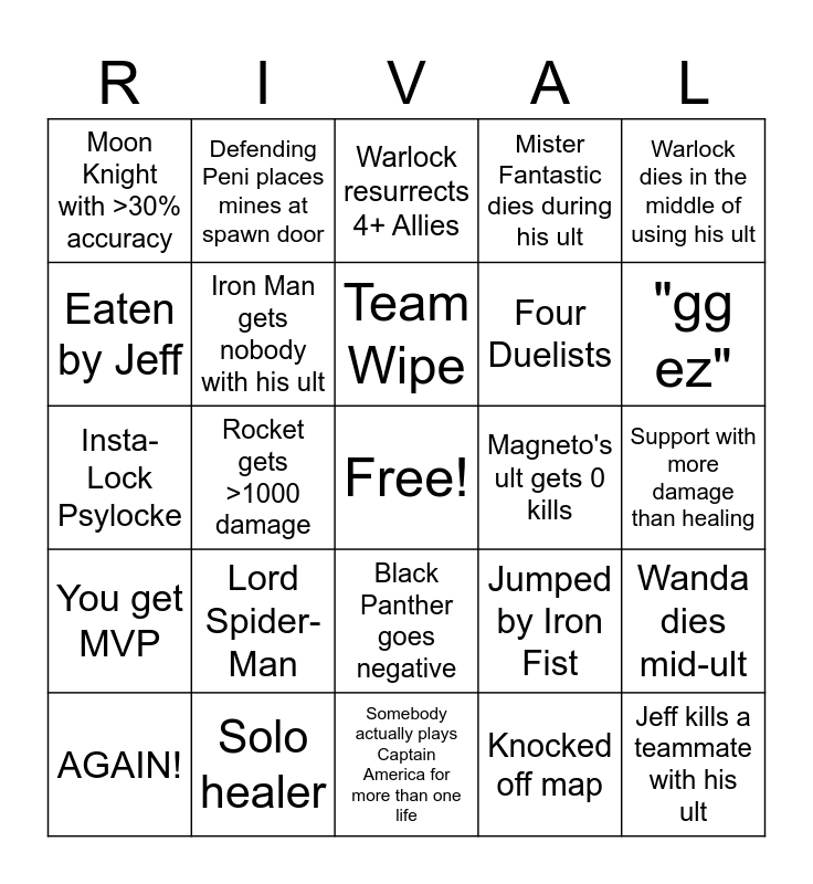 This bingo card has a free space and 24 words: Lord Spider-Man, Solo healer, Team Wipe, AGAIN!, Warlock dies in the middle of using his ult, Moon Knight with >30% accuracy, Eaten by Jeff, Defending Peni places mines at spawn door, Magneto's ult gets 0 kills, Black Panther goes negative, Four Duelists, Insta-Lock Psylocke, Jumped by Iron Fist, Wanda dies mid-ult, Iron Man gets nobody with his ult, Knocked off map, Support with more damage than healing, Warlock resurrects 4+ Allies, "gg ez", Rocket gets >1000 damage, Jeff kills a teammate with his ult, You get MVP, Mister Fantastic dies during his ult and Somebody actually plays Captain America for more than one life.