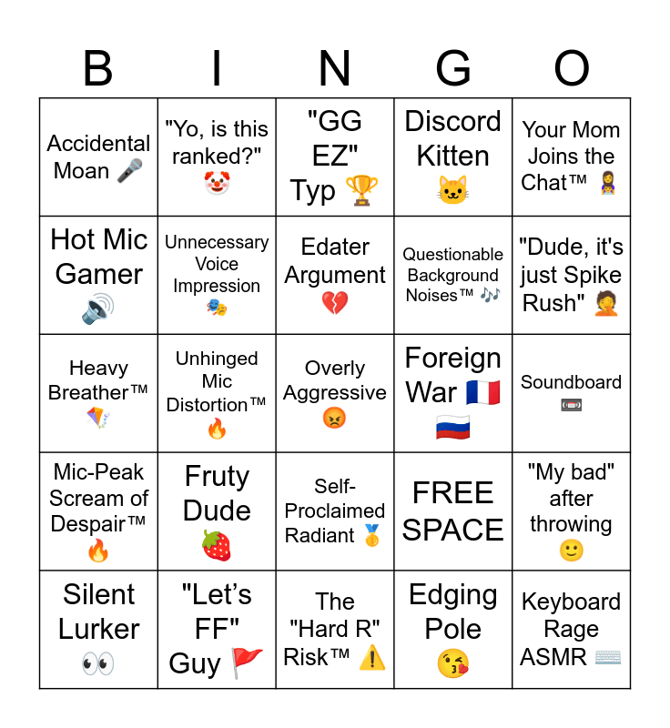 This bingo card has 25 words: Fruty Dude 🍓, The "Hard R" Risk™ ⚠️, Edater Argument 💔, Silent Lurker 👀, Your Mom Joins the Chat™ 👩👦, Accidental Moan 🎤, Hot Mic Gamer 🔊, "Yo, is this ranked?" 🤡, Foreign War 🇫🇷🇷🇺, Self-Proclaimed Radiant 🥇, Questionable Background Noises™ 🎶, Heavy Breather™ 🪁, FREE SPACE, "My bad" after throwing 🙂, Unnecessary Voice Impression 🎭, Keyboard Rage ASMR ⌨️, Soundboard 📼, "GG EZ" Typ 🏆, "Dude, it's just Spike Rush" 🤦, Unhinged Mic Distortion™ 🔥, Overly Aggressive😡, "Let’s FF" Guy 🚩, Mic-Peak Scream of Despair™ 🔥, Discord Kitten 🐱 and Edging Pole 😘.