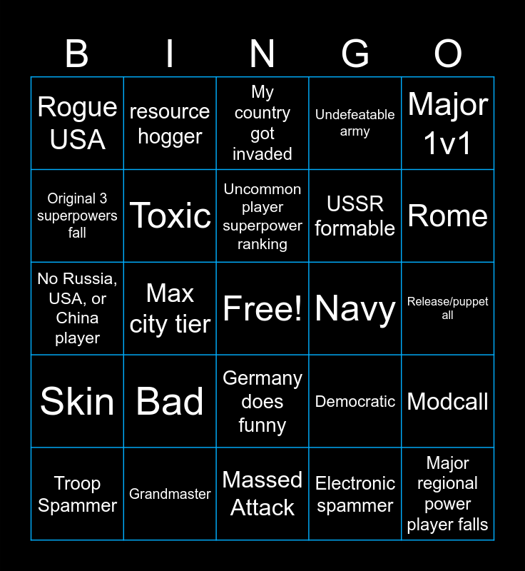 This bingo card has a free space and 29 words: Troop Spammer, Fraction, Max city tier, Rare country player, Rogue USA, My country got invaded, Toxic, Bad, Navy, Grandmaster, Release/puppet all, Major regional power player falls, Massed Attack, Electronic spammer, Rome, Tryhard, Germany does funny, Skin, Major 1v1, No Russia, USA, or China player, Democratic, NAU, USSR formable, Original 3 superpowers fall, Undefeatable army, resource hogger, Modcall, Uncommon player superpower ranking and EU.