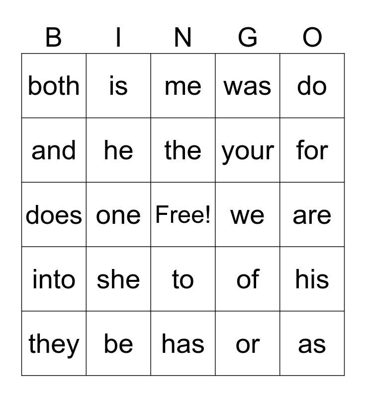 This bingo card has a free space and 29 words: they, have, one, from, both, me, he, she, we, be, are, as, has, or, for, want, to, into, do, does, of, you, your, and, was, is, his, the and shall.