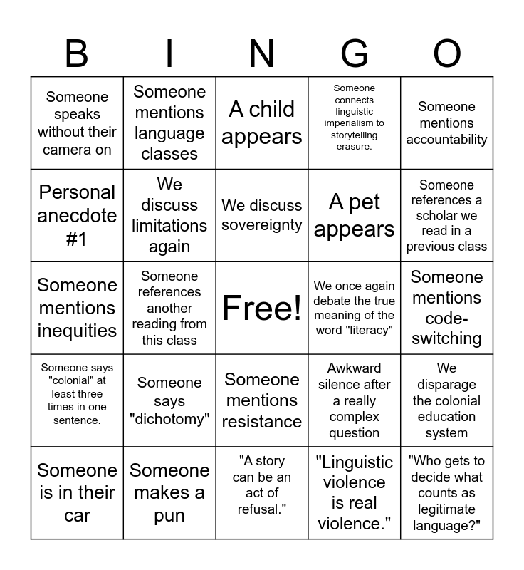 This bingo card has a free space and 24 words: Someone says "dichotomy", Someone makes a pun, We discuss sovereignty, Someone is in their car, Someone mentions accountability, Someone speaks without their camera on, Personal anecdote #1, Someone mentions language classes, We once again debate the true meaning of the word "literacy", Someone mentions resistance, A pet appears, Someone mentions inequities, Awkward silence after a really complex question, We disparage the colonial education system, We discuss limitations again, "Linguistic violence is real violence.", Someone mentions code-switching, A child appears, Someone references a scholar we read in a previous class, Someone references another reading from this class, "Who gets to decide what counts as legitimate language?", Someone says "colonial" at least three times in one sentence., Someone connects linguistic imperialism to storytelling erasure. and "A story can be an act of refusal.".