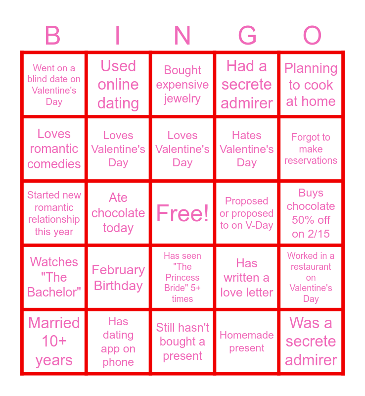 This bingo card has a free space and 24 words: Married 10+ years, February Birthday, Loves Valentine's Day, Homemade present, Planning to cook at home, Went on a blind date on Valentine's Day, Used online dating, Bought expensive jewelry, Proposed or proposed to on V-Day, Buys chocolate 50% off on 2/15, Started new romantic relationship this year, Loves Valentine's Day, Has written a love letter, Worked in a restaurant on Valentine's Day, Loves romantic comedies, Has dating app on phone, Still hasn't bought a present, Had a secrete admirer, Forgot to make reservations, Watches "The Bachelor", Ate chocolate today, Has seen "The Princess Bride" 5+ times, Hates Valentine's Day and Was a secrete admirer.