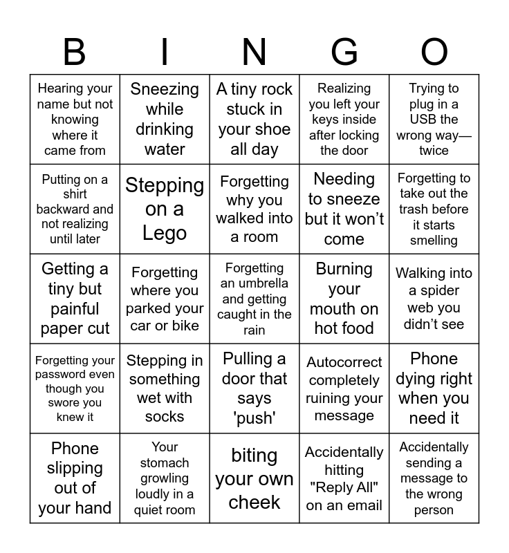 This bingo card has 25 words: Stepping in something wet with socks, biting your own cheek, Forgetting why you walked into a room, Phone slipping out of your hand, Trying to plug in a USB the wrong way—twice, Hearing your name but not knowing where it came from, Putting on a shirt backward and not realizing until later, Sneezing while drinking water, Burning your mouth on hot food, Pulling a door that says 'push', Needing to sneeze but it won’t come, Getting a tiny but painful paper cut, Autocorrect completely ruining your message, Phone dying right when you need it, Stepping on a Lego, Accidentally sending a message to the wrong person, Walking into a spider web you didn’t see, A tiny rock stuck in your shoe all day, Forgetting to take out the trash before it starts smelling, Forgetting where you parked your car or bike, Forgetting an umbrella and getting caught in the rain, Your stomach growling loudly in a quiet room, Forgetting your password even though you swore you knew it, Realizing you left your keys inside after locking the door and Accidentally hitting "Reply All" on an email.