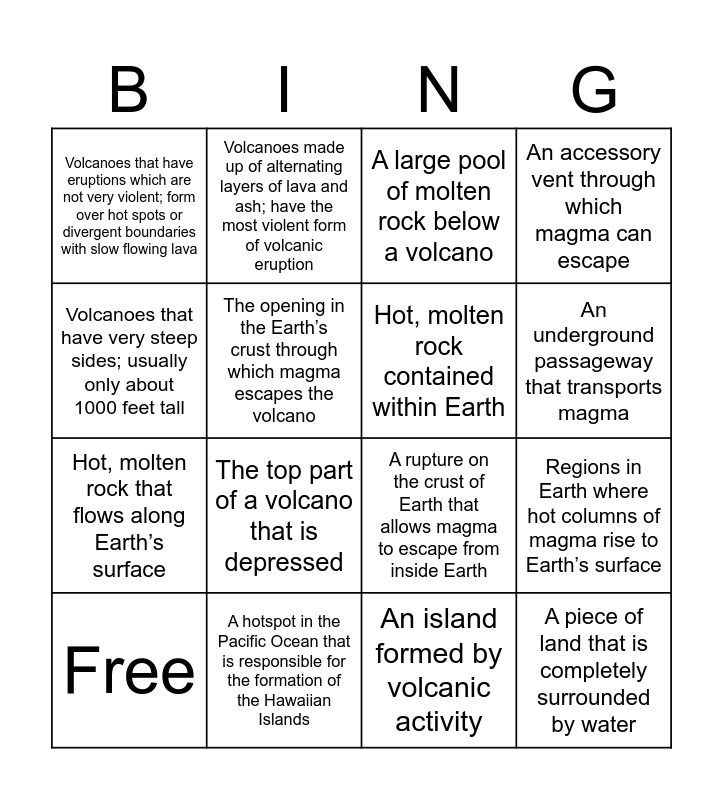 This bingo card has 16 words: A hotspot in the Pacific Ocean that is responsible for the formation of the Hawaiian Islands, Regions in Earth where hot columns of magma rise to Earth’s surface, A large pool of molten rock below a volcano, Volcanoes that have eruptions which are not very violent; form over hot spots or divergent boundaries with slow flowing lava, Hot, molten rock that flows along Earth’s surface, Volcanoes made up of alternating layers of lava and ash; have the most violent form of volcanic eruption, A rupture on the crust of Earth that allows magma to escape from inside Earth, An island formed by volcanic activity, Volcanoes that have very steep sides; usually only about 1000 feet tall, The opening in the Earth’s crust through which magma escapes the volcano, Free, An accessory vent through which magma can escape, The top part of a volcano that is depressed, An underground passageway that transports magma, Hot, molten rock contained within Earth and A piece of land that is completely surrounded by water.