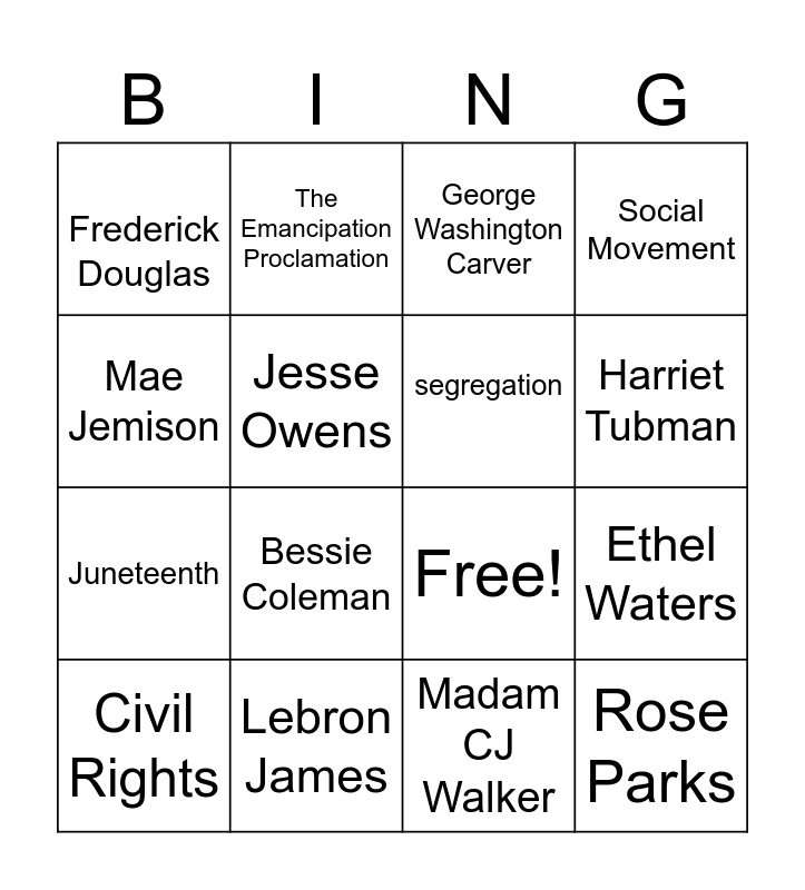 This bingo card has 21 words: Lebron James, Rhythm and Blues, The Emancipation Proclamation, Dr. Martin Luther King, Madam CJ Walker, segregation, Frederick Douglas, George Washington Carver, Free!, Harriet Tubman, Juneteenth, Social Movement, Rose Parks, Ruby Bridges, Jesse Owens, activism, Civil Rights, Bessie Coleman, Mae Jemison, Ethel Waters and Alice Coachman.