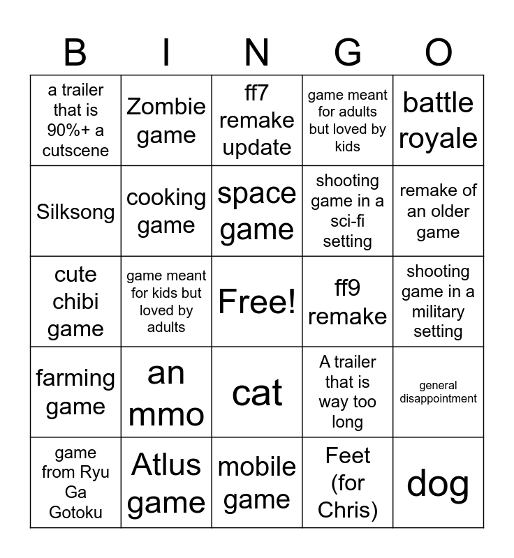 This bingo card has a free space and 24 words: an mmo, Atlus game, space game, game from Ryu Ga Gotoku, battle royale, a trailer that is 90%+ a cutscene, Silksong, Zombie game, ff9 remake, cat, shooting game in a sci-fi setting, cute chibi game, A trailer that is way too long, general disappointment, cooking game, Feet (for Chris), shooting game in a military setting, ff7 remake update, remake of an older game, game meant for kids but loved by adults, dog, farming game, game meant for adults but loved by kids and mobile game.